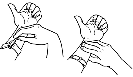 Figure 4-17  Putting on the tourniquet and feeling for a pulse.